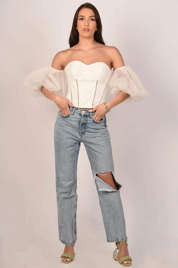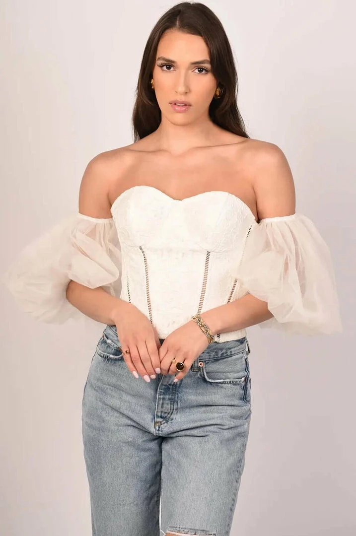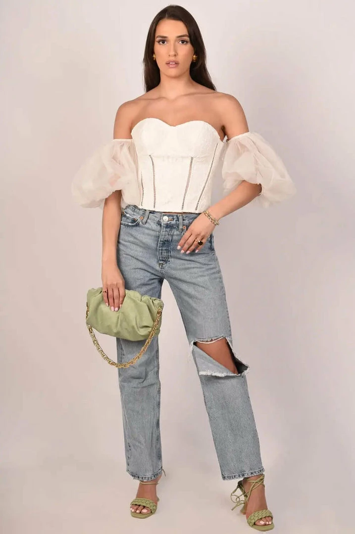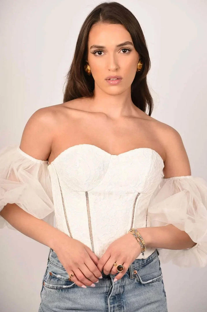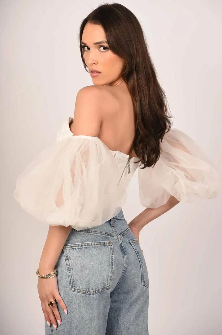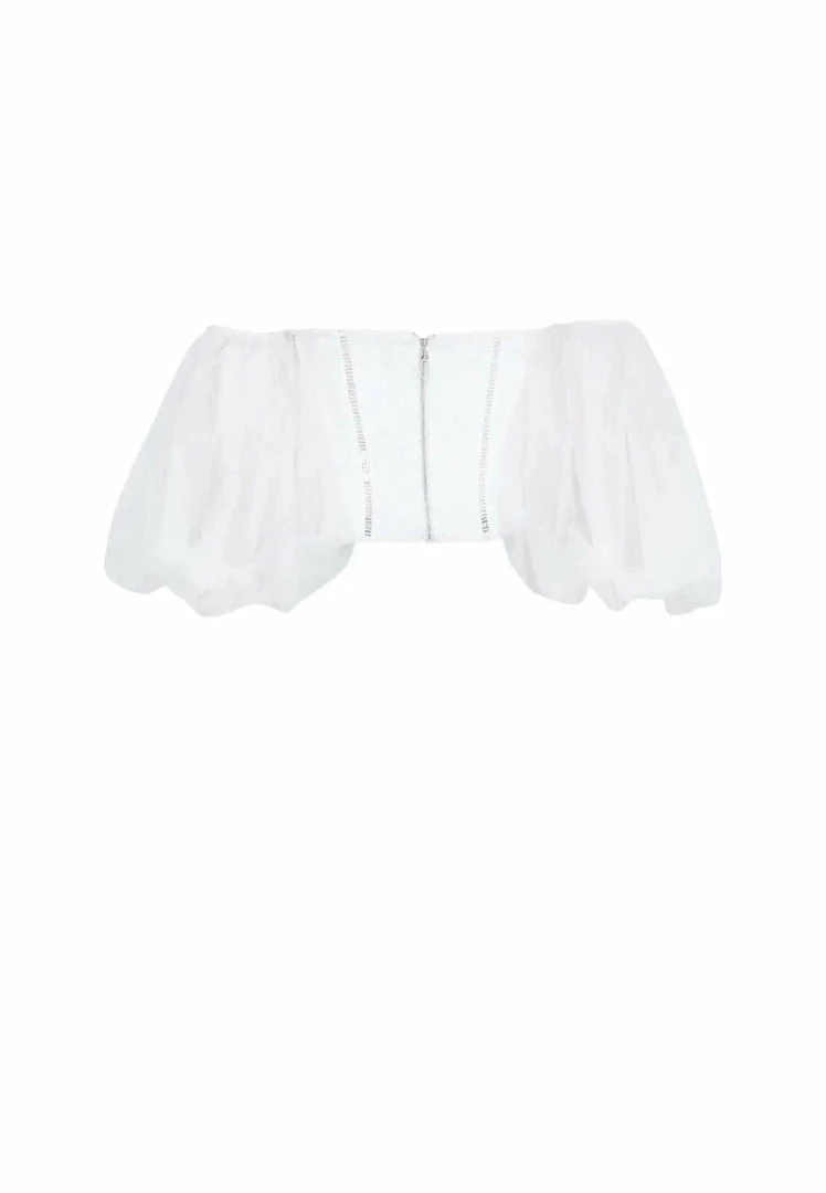 An elegant off-shoulder top with striped embroidery, accented with ruffled lace Dolby sleeves. The fitted, structured bodice creates a slimming silhouette, which is complemented by the breezy sleeves with raw edges. The linear embellishment is subtle and elevates the fabric. A perfect evening blouse to pair with wide-leg pants or a fitted skirt.