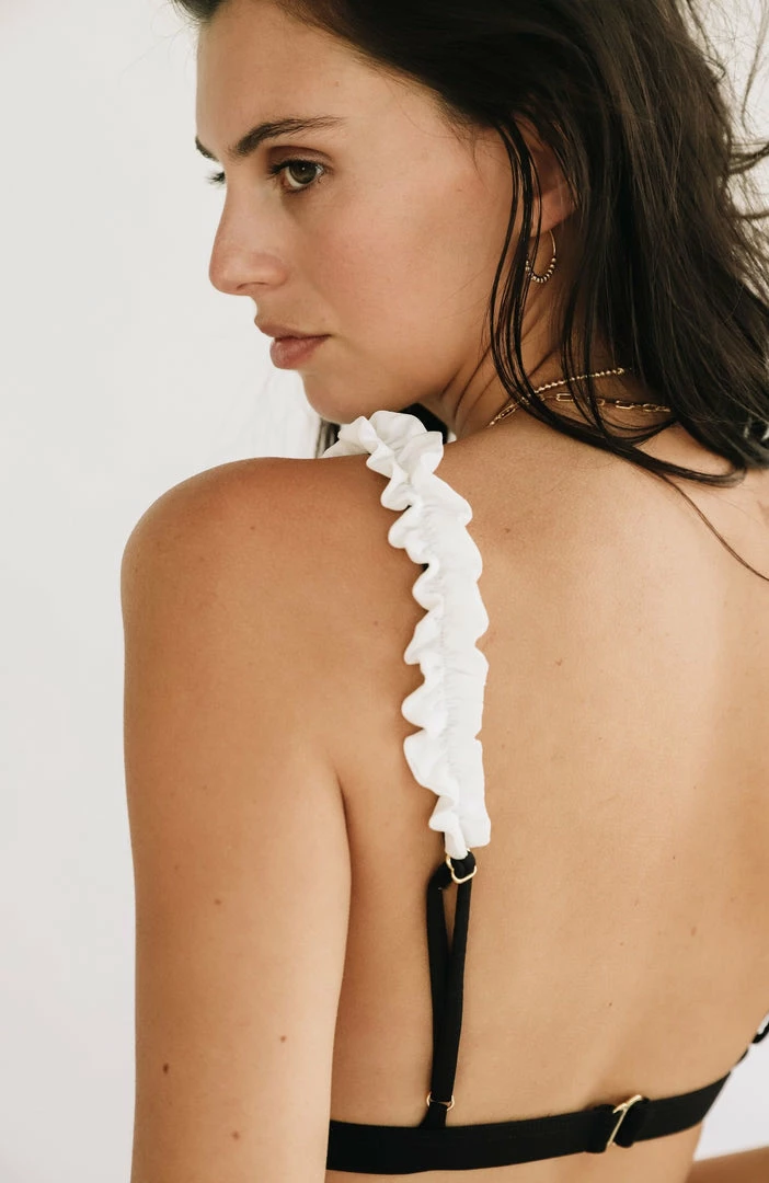 The Akalia Swimwear Chloe Triangle Bikini Top features a classic triangle top silhouette. This stylish top is double lined for all day comfort, with a cross over neckline that adds extra support and lift, adjustable straps and chiffon details on the shoulders. Pair with the matching Akalia Swimwear Chloe Bikini Bottom