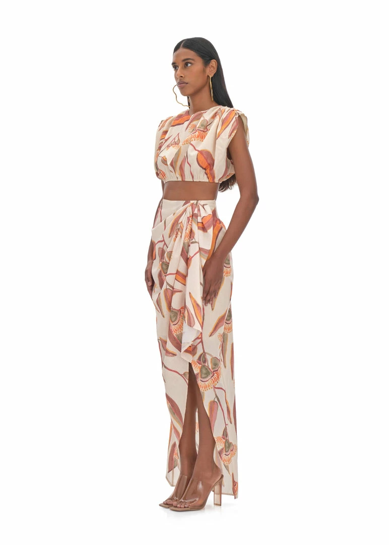 The HALIMA wrap skirt is your summer must- have skirt. This skirt delicately drapes around your waist and hips to create a wrap look that flatters your figure. Confidently pair the HALIMA skirt with the HALIMA cropped top for a look that is cocktail party worthy.