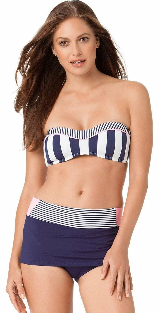 The Anne Cole High Waist Skort Bottom sits high on the waist with a striped and draped detail. These bottoms offer full coverage.