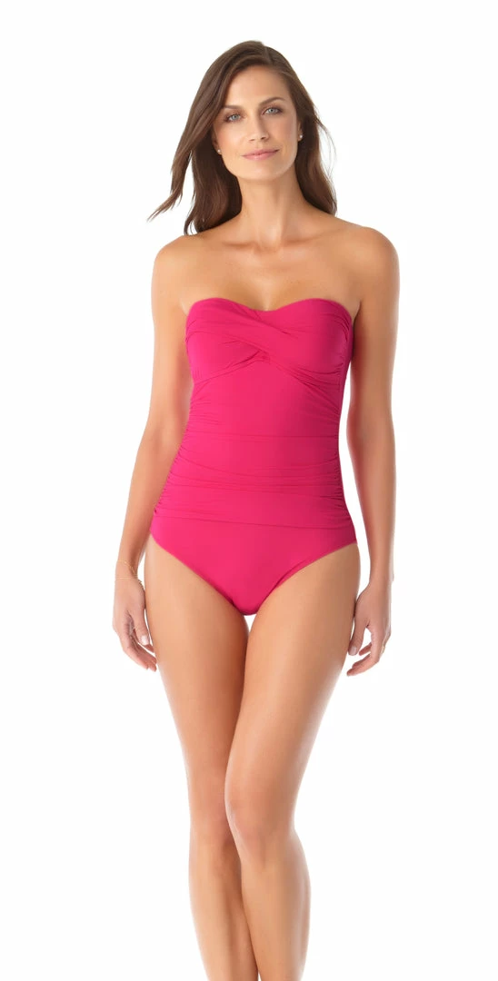 This Anne Cole Twist Front Bandeau One Piece features a twist detail at the bust and shirring throughout the torso for a comfortable and flattering fit. This suit comes with removable straps and offers full bottom coverage.
