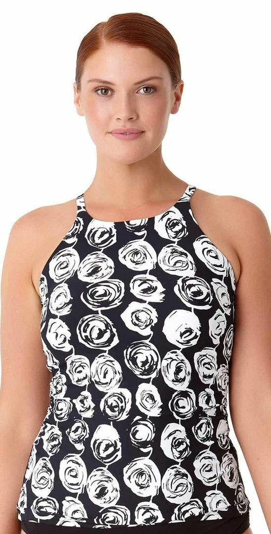 The Anne Cole Plus Coming Up Floral high neck tankini top offers a black and white rose design with a shelf bra and removable soft cups. The high neckline has a hook closure around the neck. This top looks great paired with any solid Black bottom like the Anne Cole Plus Live in Color High Waist Shirred Bottom
