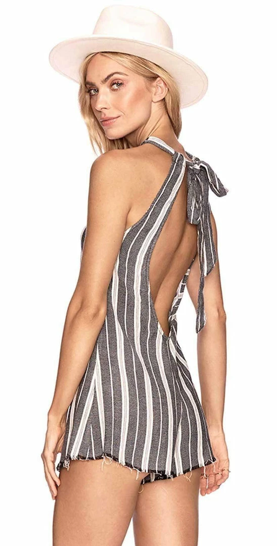 The Beach Riot Desert Romper is a boho chic striped high neck romper with an open back, halter style neck tie and frayed edge detail along the bottom.