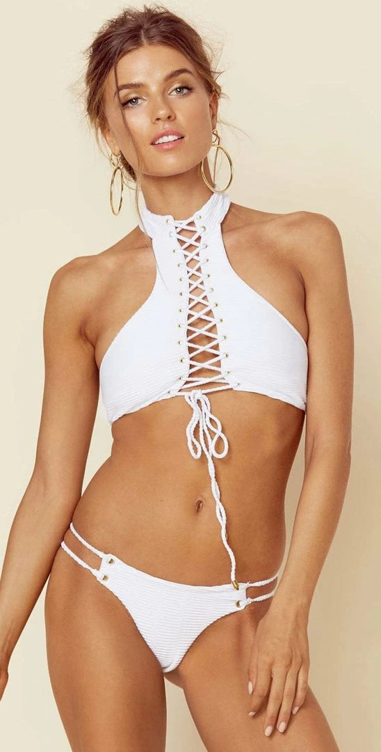 This Blue Life’s Vixen Top features a halter neck with clasp, lace up detailing, textured spandex fabric, and back clasp closure. Pair this sexy top with the matching bottoms here.