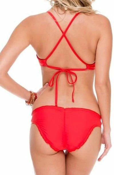 The Luli Fama Cosita Buena Full Bottom in Red is a hipster cut, fiery red bottom featuring a ruffle edged hem and a ruched back for a cheeky look.
