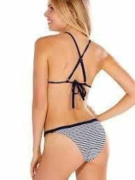 The Regatta Stripe Triangle bikini Top by Peixoto offers a nautical feel with navy and white stripes. This triangle top features criss-cross back straps. Pairs with the matching bottom