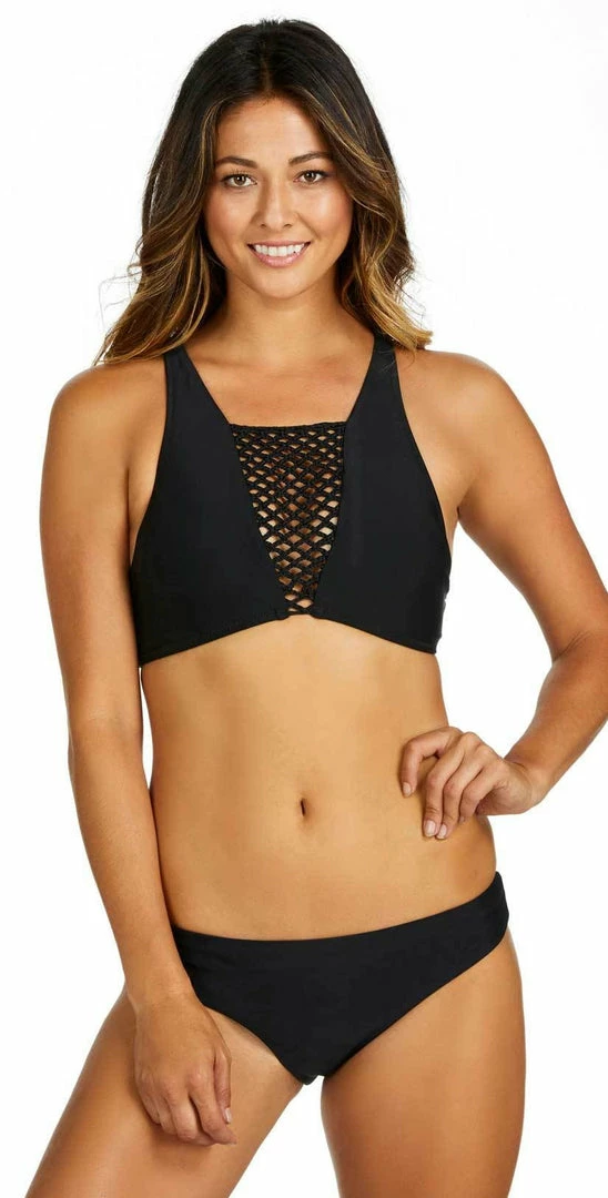 The Raisins Sayulita Mai Tai Bottom in Black features a low-rise, hipster cut bottom with macrame detail at the hips. This bottom offers moderate coverage and pairs with the Raisins Sayulita Newport High Neck Top.