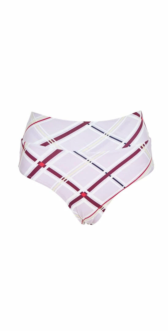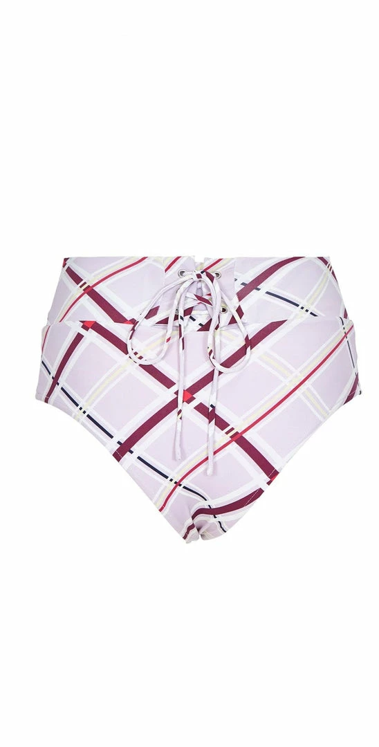 The Henley Bottom adds a modern twist to high waist bikini bottom with lace-up ties in the back. These bottoms feature a silver grommet detail and are made with luxurious textured swimwear fabric.