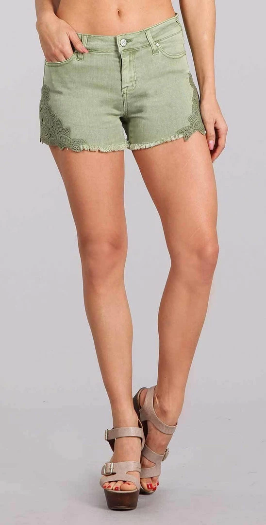 The Celebrity Pink Jean 3″ Mid Rise Crochet Applique Shorts in Reseda are green frayed shorts with a crocheted applique along the sides of the shorts. These crochet detailed shorts are classy boho and unique.
