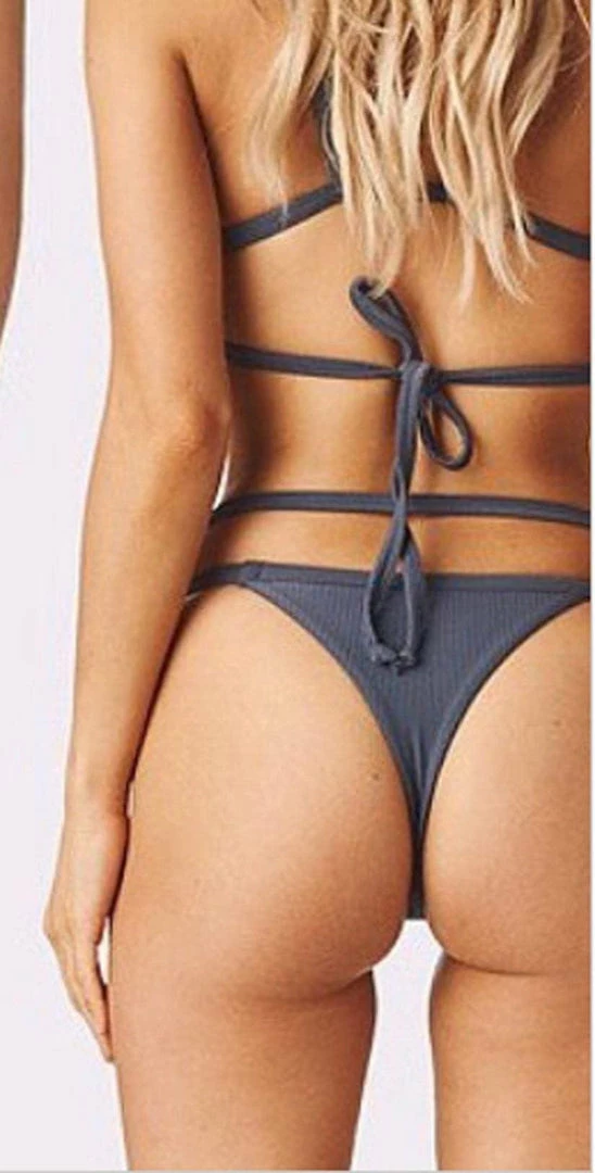 The Chloe Rose Birds of Paradise Stone Triangle Bikini Set features a wrap style top with torso straps that wrap and tie in back. The top offers fixed triangle cups while the skimpy bottoms have side cutouts and offer very cheeky coverage in back.
