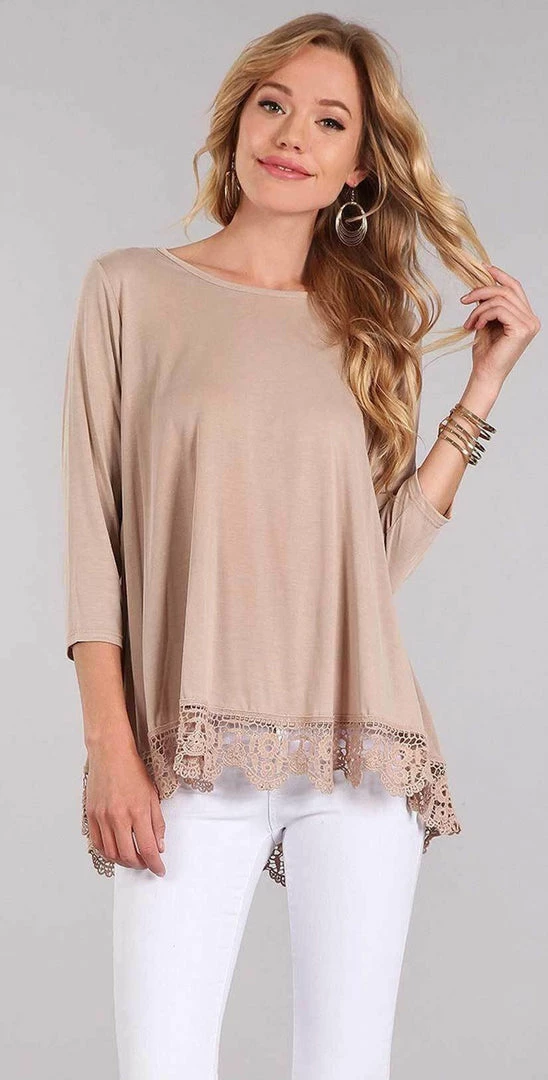 The Chris and Carol Lace Bottom Trim with 3/4 Sleeves In Beige is a flowy, figure flattering shirt that be paired with cute shorts or colored pants. This neutral colored shirt is a versatile shirt that can be worn with anything and anywhere.