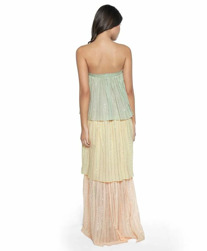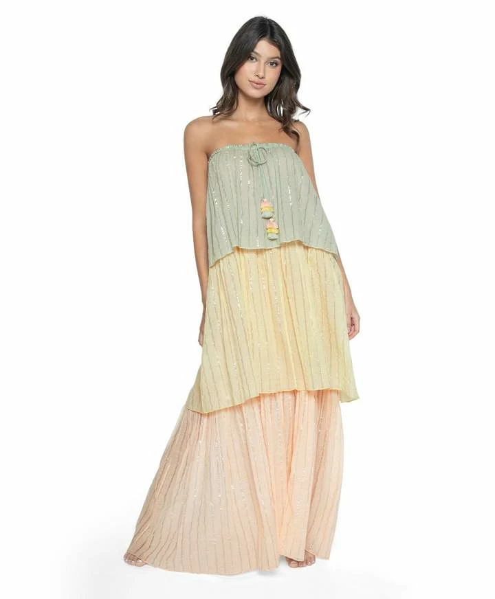 The PQ Swim Briar dress is a three-tiered color block dress that has you looking elegant and chic. Features a slight shimmer and cute colorful tassels!