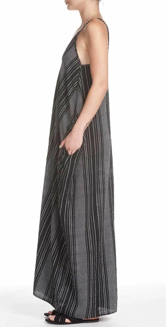 The Elan Balloon Maxi in Black And White Stripes is a super comfortable long dress with thin straps. This long maxi has a v neck front with side pockets and a balloon style to make this dress extra flowy.