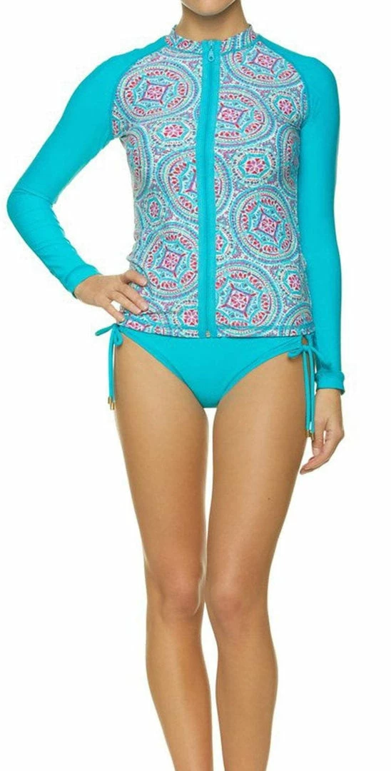 The Helen Jon Mandalay Marimar guard, swim shirt or surf shirt. By any name, we know you will love our classic swim shirt. Feminine and stylish, with a slim fit stays close to your body without being too snug. And the bold interplay of patterns that make this a true stand-out.