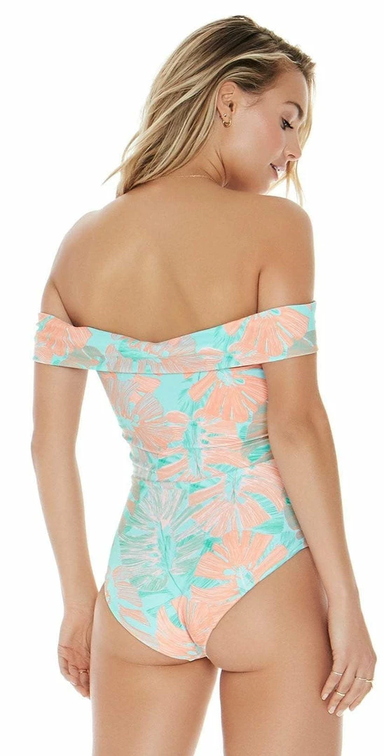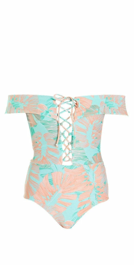 The L Space Anja One Piece in Bungalow Palm is a pastel printed One Piece featuring a deep plunge, lace-up design that ties in the center. This super adorable suit features an off the shoulder look with fold over details and a sexy high thigh.Â