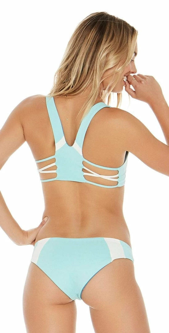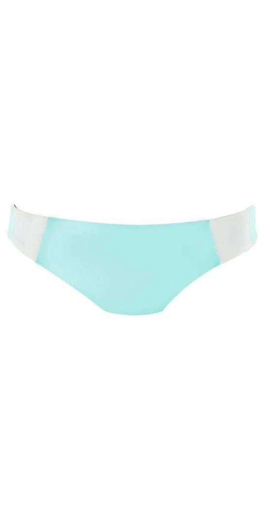The L Space Mia Color Block Bottom in Light Turquoise is a hipster bottom that features white stripe details on the hips and reverses to a solid dark green. This bottom offers a cheeky cut in back and pairs perfectly with L Space Rylie Color Block top.