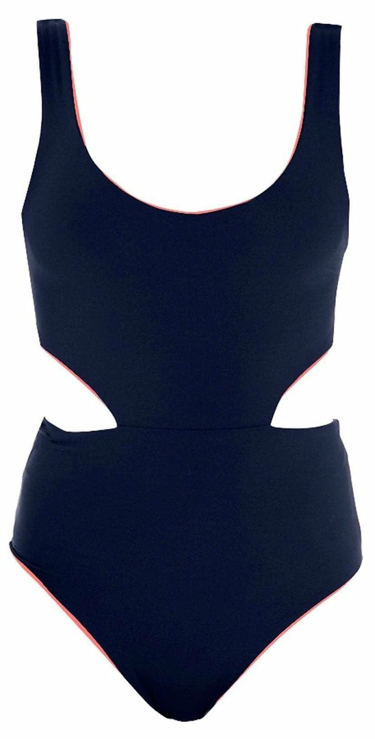 This Rita One Piece in Midnight Blue by L Space features sexy side cut outs that continue on the back for an extra peek-a-boo of skin. This suit reverses to a solid bright pink. Offering cheeky coverage, this one piece looks like a bikini from the back.