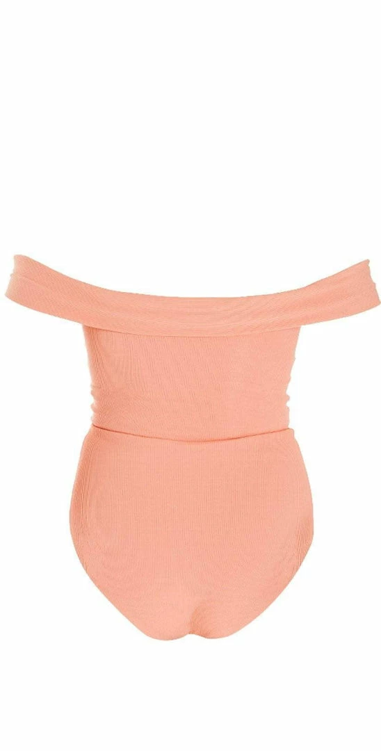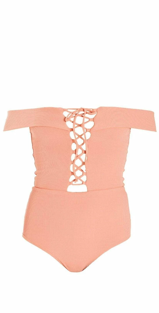 The Anja by L Space is an off the shoulder one piece in a gorgeous tropical peach color featuring a soft ribbed material and a super sexy deep plunge, with a lace up detail that ties at the center. This suit offers a higher cut thigh and moderate bottom coverage.