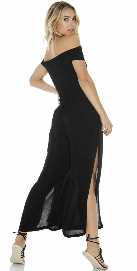 This L Space Sao Paulo Romper in Black is an off-the-shoulder dress lined with shorts featuring an elastic waist-band and semi-sheer material. Feel sophisticated and sexy with side slits that ride up above the knee and an irresistible lace up detail at the center, perfect for a night out or cover up at the beach!