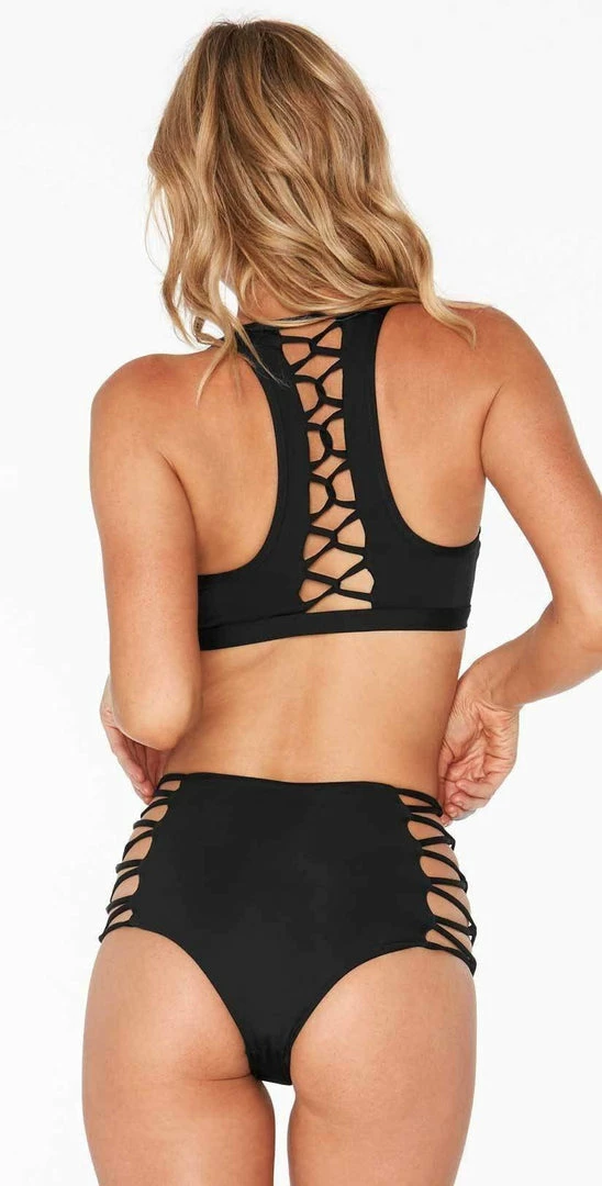 The L Space Skylar Top in Black is a flirty, feminine black V-neck with a sporty lace up detail along its racerback. This top features a banded bust for support and a no fuss fit. Pairs perfectly with the matching L Space Tripp Bottoms!