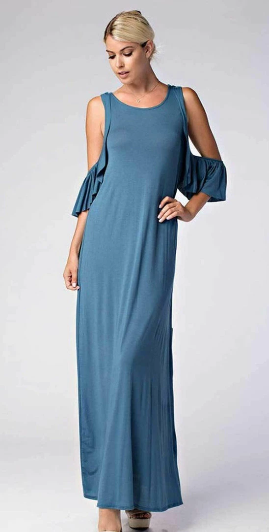 The Love In Cold Shoulder Round Neck Ruffle Maxi Dress is a long dress with side slits and ruffle detail perfect for date night! This denim blue dress is lightweight flowy and perfect almost all year round.