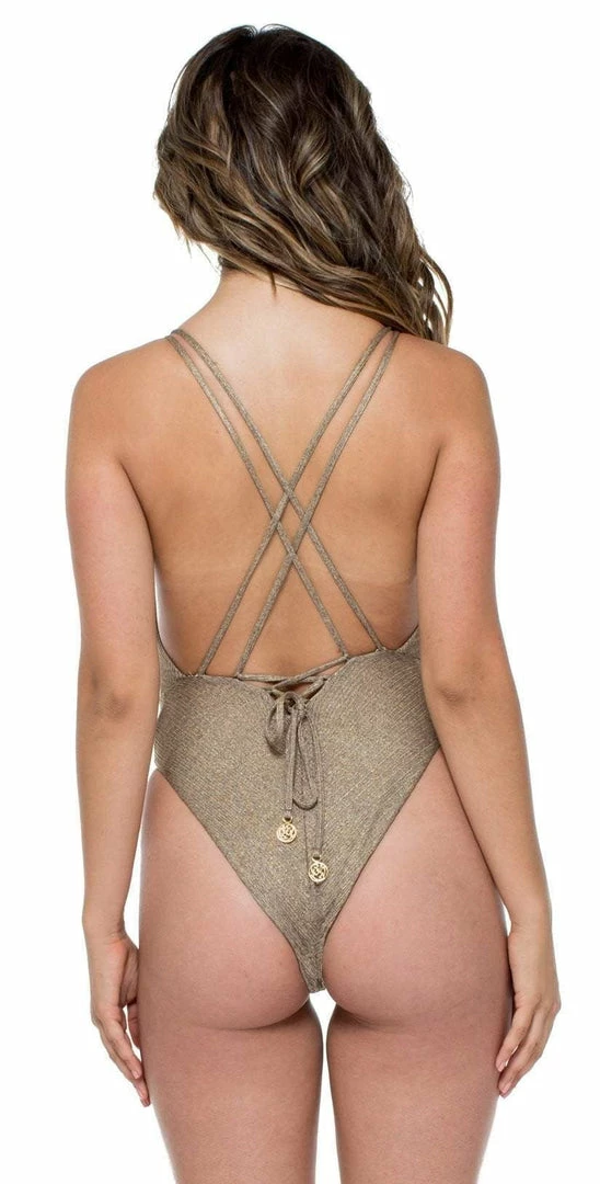 This Luli Fama Compai One Piece swimsuit in Bronze offers a plunging deep v-neckline, a crisscrossing, strappy back with lace-up detail right above the rear. The bottom offers cheeky coverage. Â