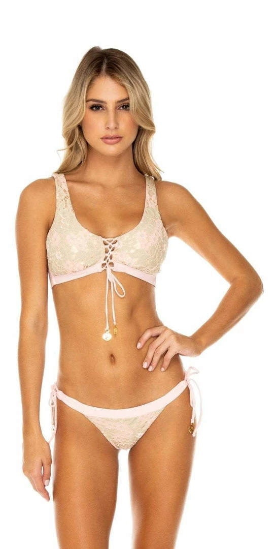 The Luli Fama Gitana Loop Tie Side Moderate Bottom sits low on the hips with a loop tie side detail for a custom fit. These bottom have a delicate lace overlay and offer moderate to cheeky coverage.