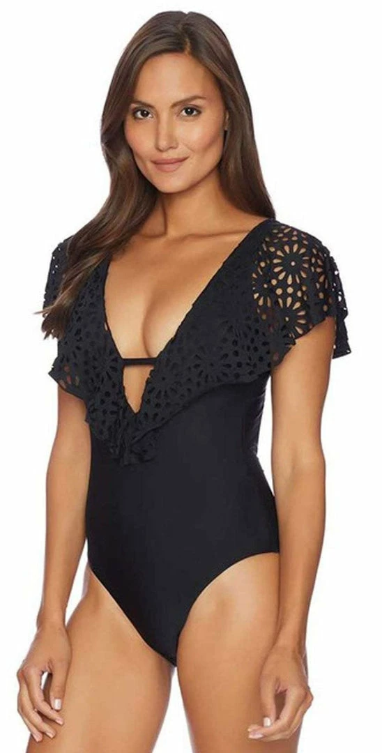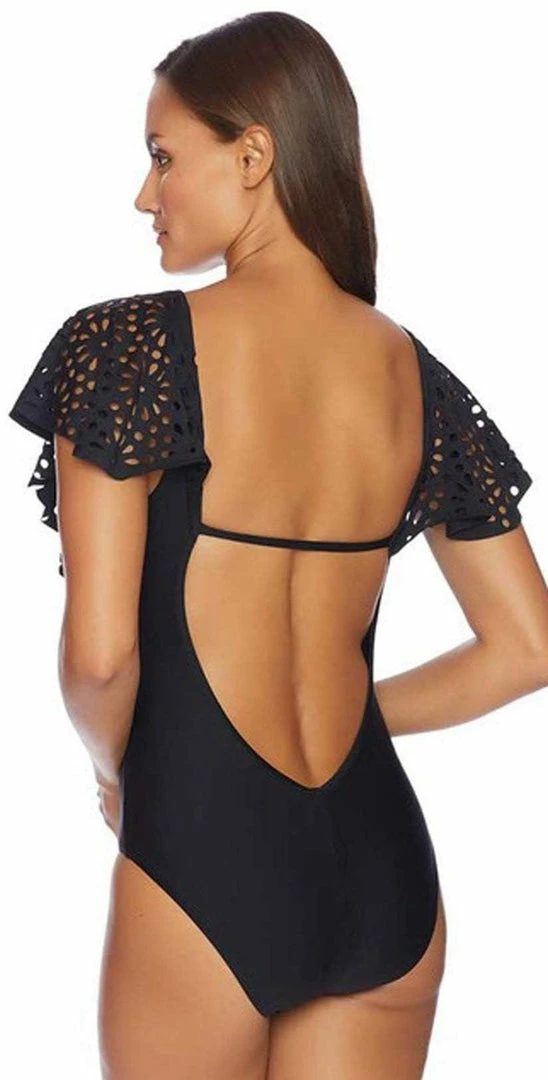 The Luxe Aphrodite One Piece In Black features a laser-cut detail on the ruffled sleeves and offers a deep, plunging v neck front and a sexy low scoop back with a full coverage bottom.