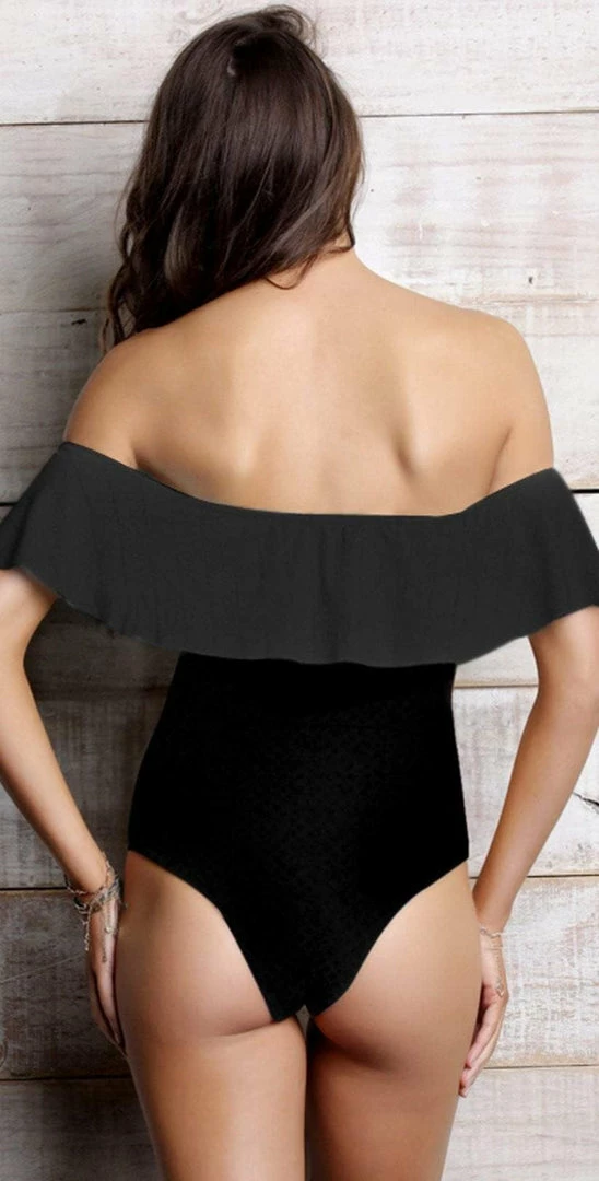 This Maylana Allegra One Piece in Black features a sexy shoulder-baring neckline with flutter detail all the way around.The top is un-padded and the Brazilian cut bottom offers very cheeky coverage.