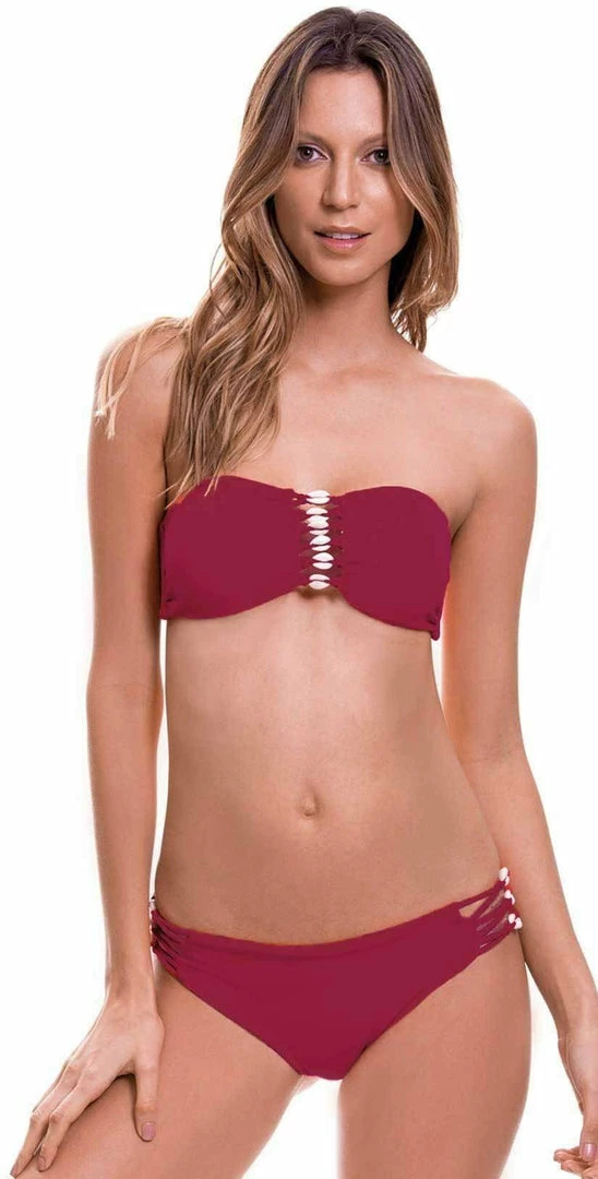 The Milonga Shell Bottom in Wine is a low-rise bikini bottom in a rich Burgundy color with a multi strap detail at the hips and shell embellishment. This bikini bottom offers moderate back coverage and pairs with the matching Milonga Shell Bandeau Top in Wine.