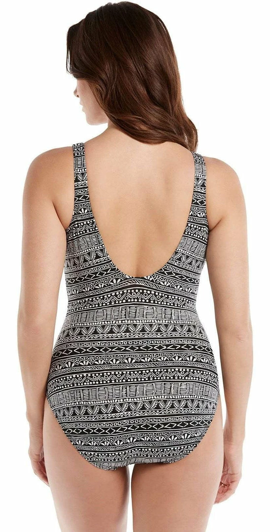 The Miraclesuit Castaway Stripe Odyssey One Piece is a black and white one piece with a slight shimmer in the fabric. This one piece swimsuit features a V-neck, soft cups and thicker straps for added support. This suit offers full bottom coverage.Â