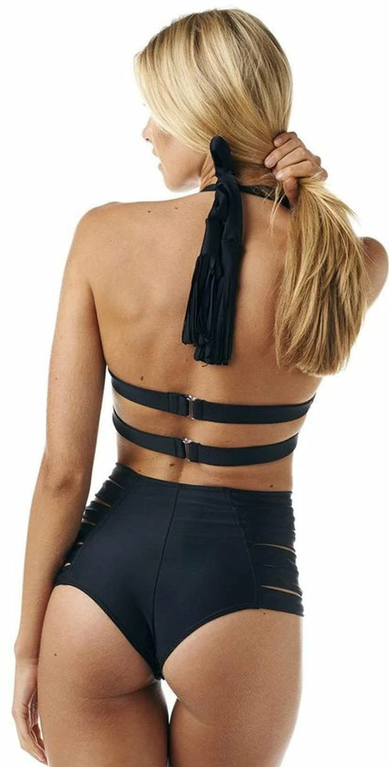The Montce Dunes Monokini in Black is a sexy swimsuit with cutout details throughout the torso, hips and back and at the center bust. The back features a double hook closure for added support and the Brazilian cut bottom offers very cheeky coverage.