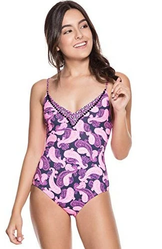 This OndadeMar Summer Pansy One Piece Swimsuit has a fun, pink paisley print with adjustable straps and a cut out detail in back. This girls suit is fully lined with no cups and full bottom coverage.