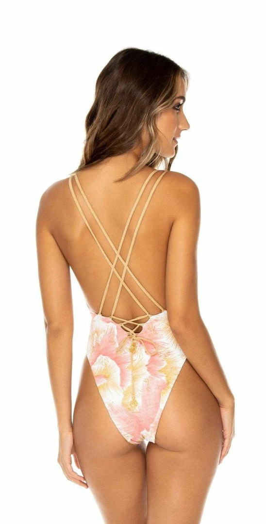 The Luli Fama Costa Del Luz Reversible Deep V-Neck One Piece reverses to a solid deep gold and features a deep V-neck with criss-crossed back straps and a high cut leg. This suit offers cheeky bottom coverage.