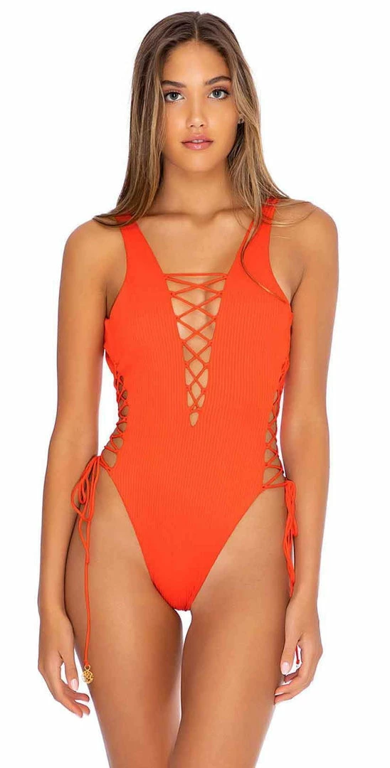 The Luli Fama Orillas Del Mar Open Side One Piece Bodysuit in Fuego features a super sexy plunging, lace up deep V-neck with open lace up sides for a custom fit. This one piece has textured fabric and offers cheeky bottom coverage. This hot orange one piece is a must have swimsuit for the summer!