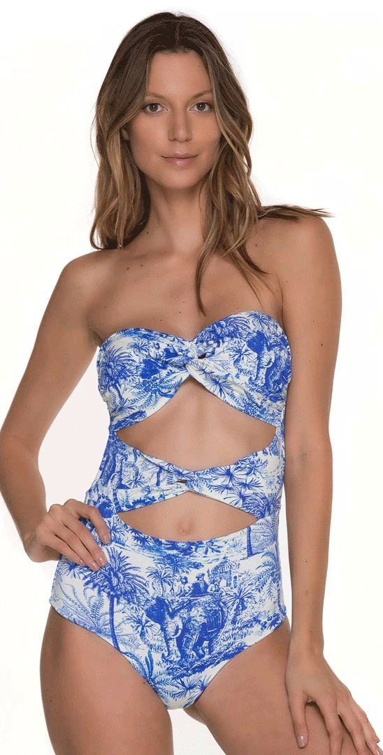 This high fashion cut out one bandeau one piece is a fun blue and white printed suit. This suit from Malai is cut out down the front, ties at the back and has a merlot colored liner.