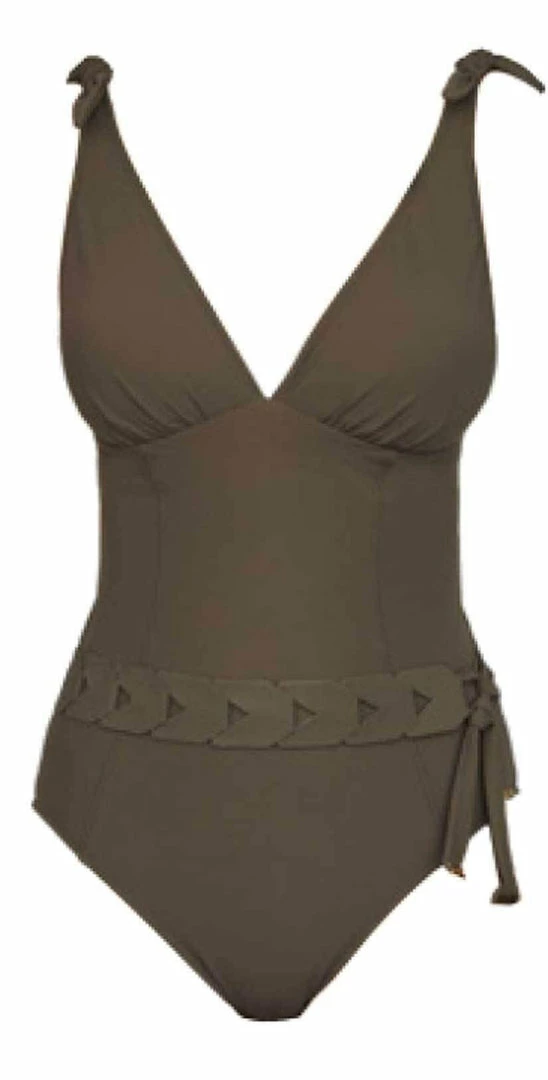 The Nuria Ferrer Bruna one piece in Khaki Green offers a plunging neckline with soft foam cups built in. Adjustable over the shoulder straps offer a cute tie detail. Chain link style fabric belt detail adds a dressed up look to this bathing suit.