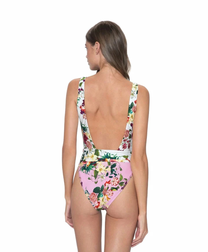 This one piece will be sure to make you stand out this season! The low V neckline, added tie feature around the waist, and an open back are the perfect details for that sexy beach look! Does not have removable padding.