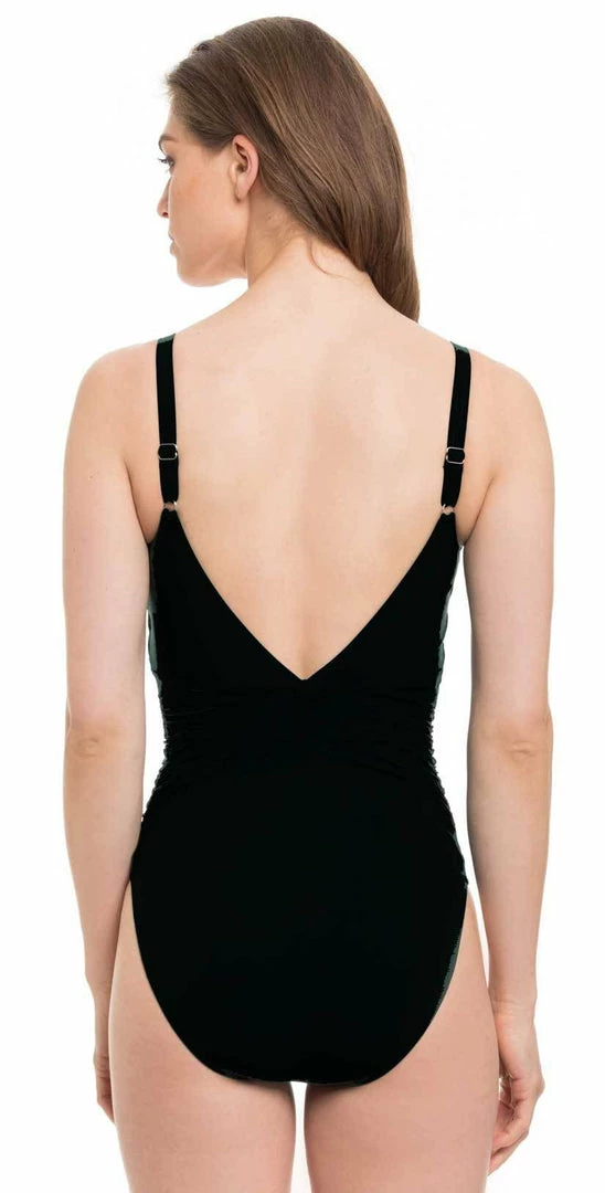 The Profile by Gottex Tutti-Frutti Cut Out One Piece is an all black one piece with a plunging neckline and a lace up detail with ruching at the waist. This all black one piece offers an amazing fit with soft cups, adjustable straps and a v back with full bottom coverage.