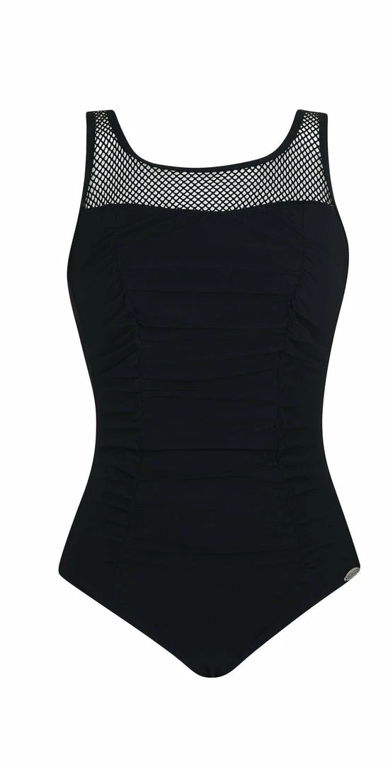 The Sunflair Garden Dots Mastectomy One Piece Swimsuit In Black is a high neck all black one piece with pockets for an optional prosthesis with a full coverage bottom and a low scoop back.