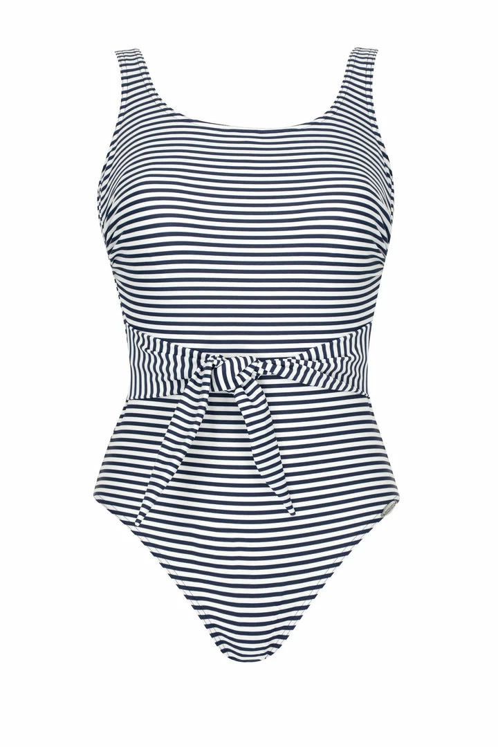 The perfect summer one piece! This Sunflair classic nautical design of blue and white pairs beautifully with the mid-section tie detail. Designed with soft cups and front and backlining.