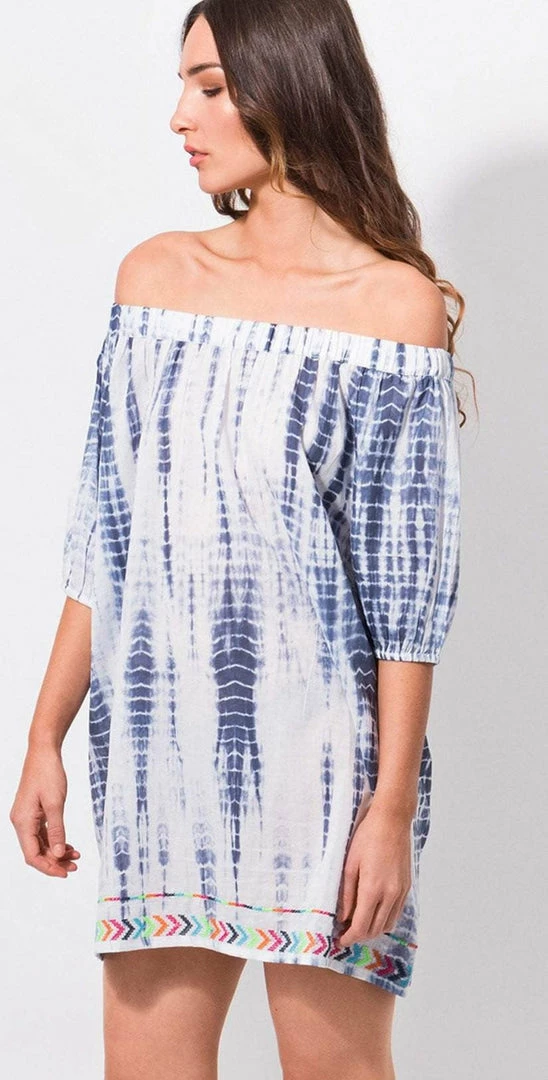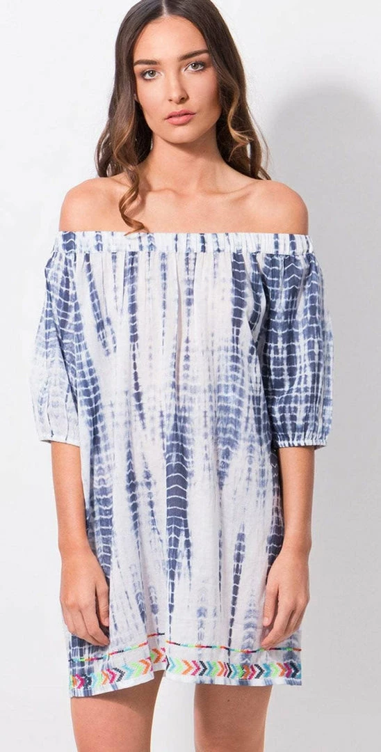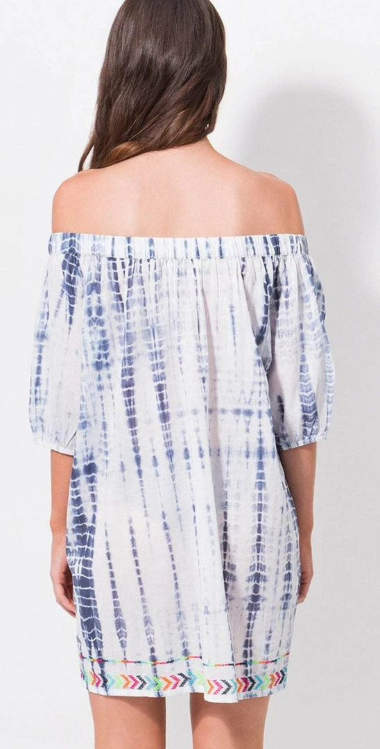The Pia Rossini Delray Bardot Beach Dress is an off the shoulder dress that is blue and white tie dye throughout. This dress falls to your mid-thigh and has rainbow stitching.