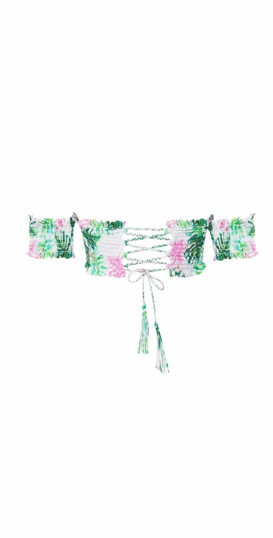 The PilyQ Mingos Smocked Off the Shoulder Top is a pink and green floral tube top off-the-shoulder look. You’ll love the comfortable smocked material and multi-wear use, wear this top with the sexy lace up detail in the front, or turn it around and wear it in back! Pair with the Full Cut or Teeny Mingos Bottoms!