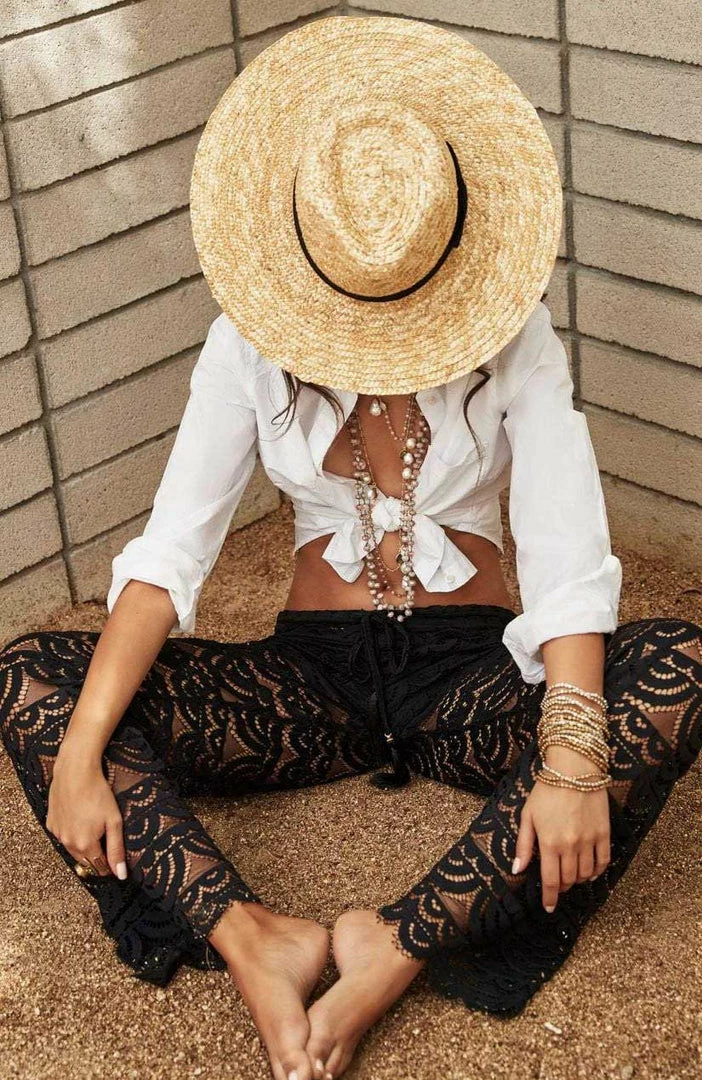 PilyQ Lace Diva Malibu Pant in Black is a wide leg, sheer lace pant with a tassel and bead detail drawstring tie at the waist. These lace pants are light and airy, perfect over your favorite bikini!