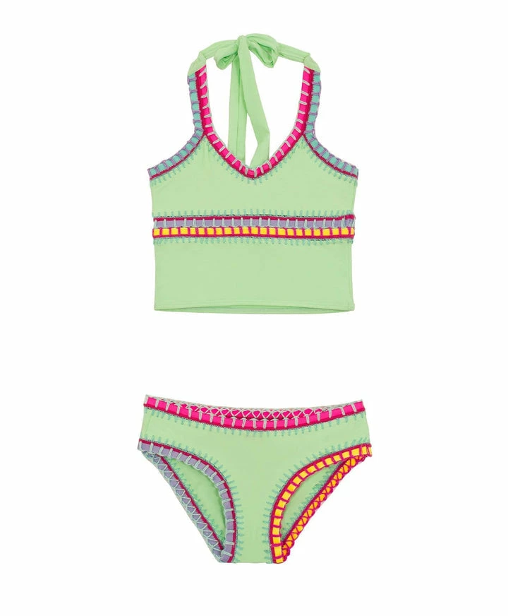 This adorable PQ Swim tankini is inspired by Solange Ferrarini. Features a beautiful aloe green color with raimbow design trim, embroidered trim and tie closure in the back. If unsure of what size to pick, size up!