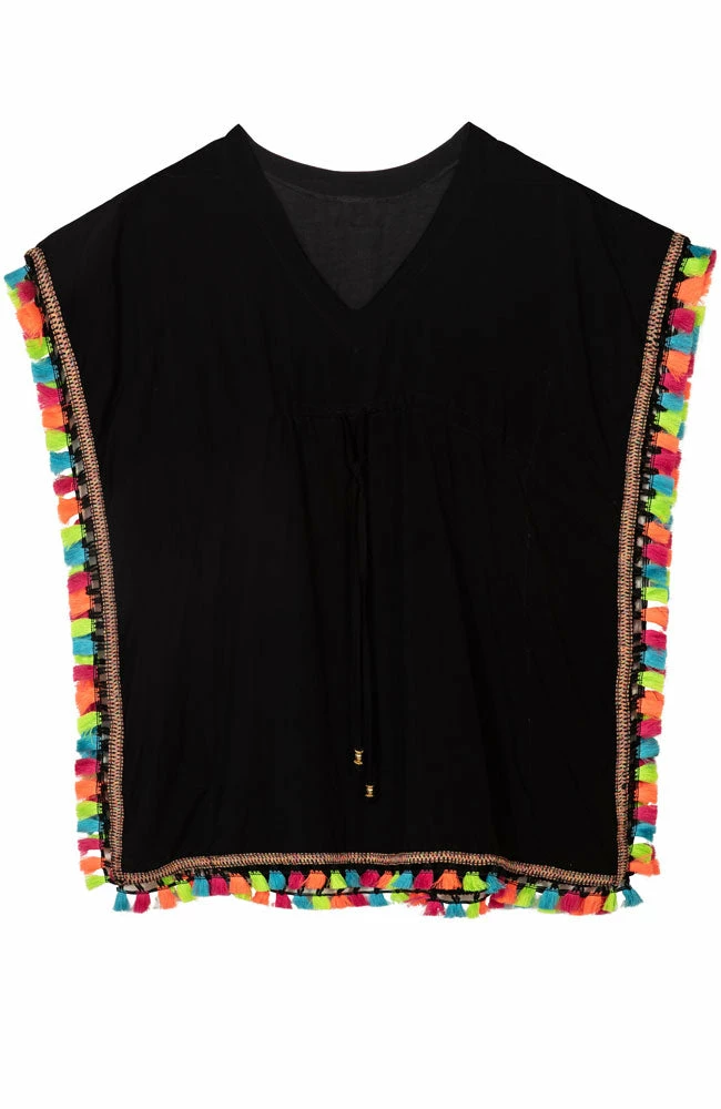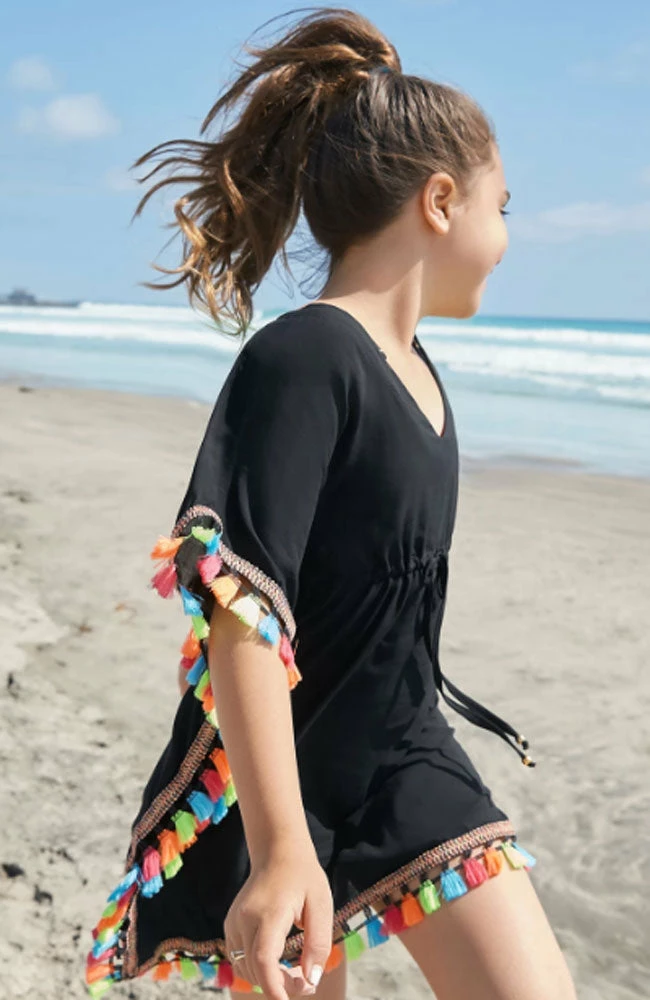 This PQ Swim is a classic black tassel poncho that is a perfect coverup for your little one for a pool or beach day. This piece features stylish batwing sleeves and rainbow tassel trim.