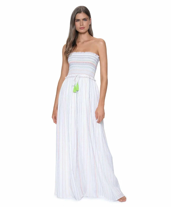 This is a perfect floor length summer dress featuring a smocked top with ruffle trim & multi-colored stripes. Also includes a drawstring with tassels around the waist. This dress is perfect for your next date night!