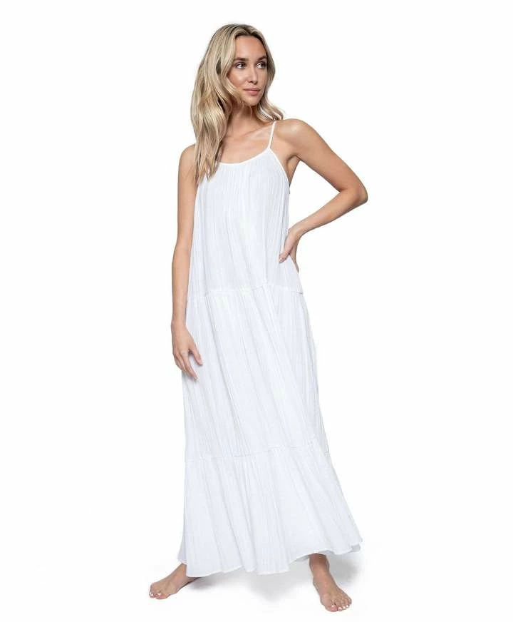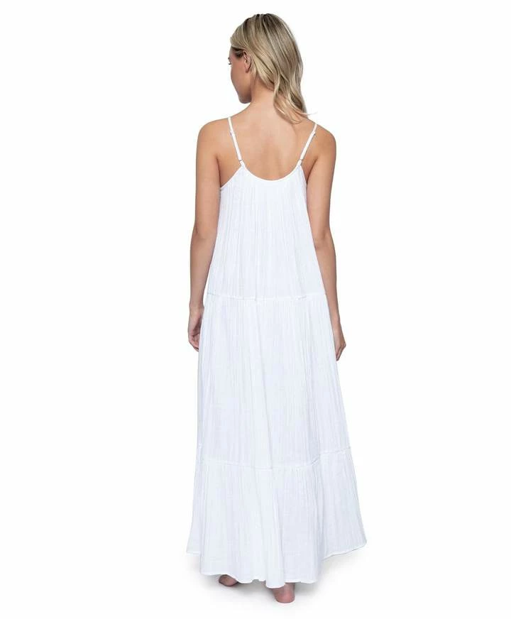 This PQ Swim Water Lily Ramona dress is floor length and has a subtle three tier design. Comes with adjustable straps and can be worn from the beach to a date night!
