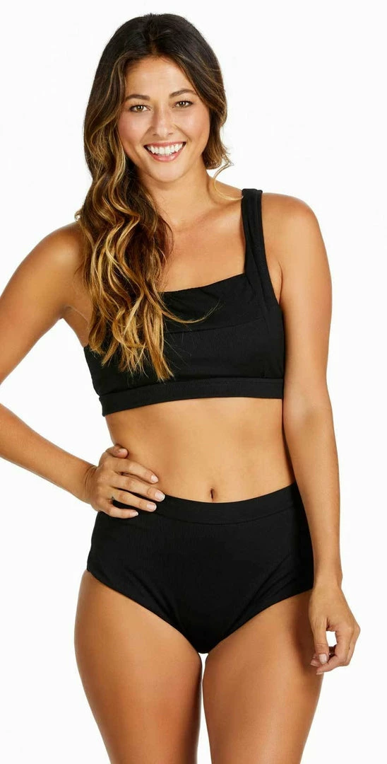 The Raisins Ribbed Summer Halter Top in Black is a bralette-style bikini top with a square neckline. This top features ribbed fabric, removable soft cups and a cut out back with a gold tone hook closure at the back. Pair with the Ribbed Poolside Bottom to complete the look!