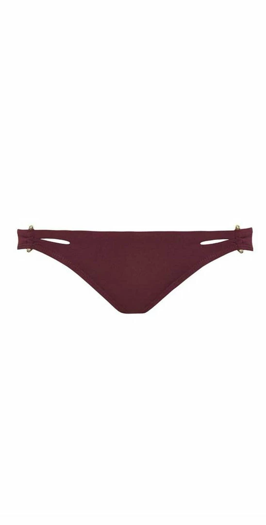 The Robin Piccone Luca Cut Out Bikini Bottom in Rubine is sexy and functional. Featuring gold metal accents with moderate back coverage and cut out details at the hips. Pair with the matching Luca Keyhole Bikini Top in Rubine.
